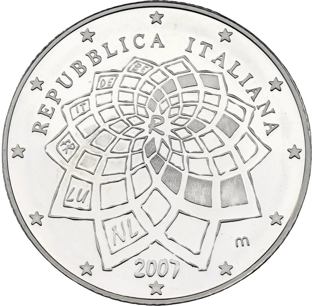 Description: The Campidoglio Square pavement, designed by Michelangelo, features a central 'R' for Rome, where the treaty was signed. To the right, an 'E' for Europe is formed by geometric elements. To the left, the initials of the six signatory countries (BE, DE, IT, FR, LU, NL) are incorporated. The date is below, and the twelve stars of the European Community encircle the rim above.