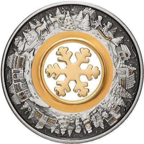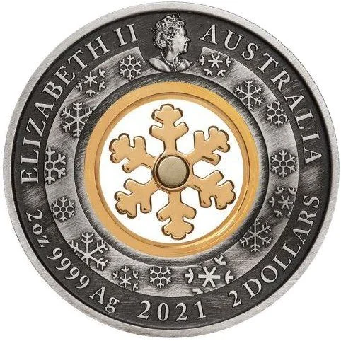A crowned right-facing portrait of Queen Elizabeth II, wearing the George IV State Diadem and Victorian Coronation Necklace, above a ring of 15 varied snowflakes encircling a gold-plated snowflake.