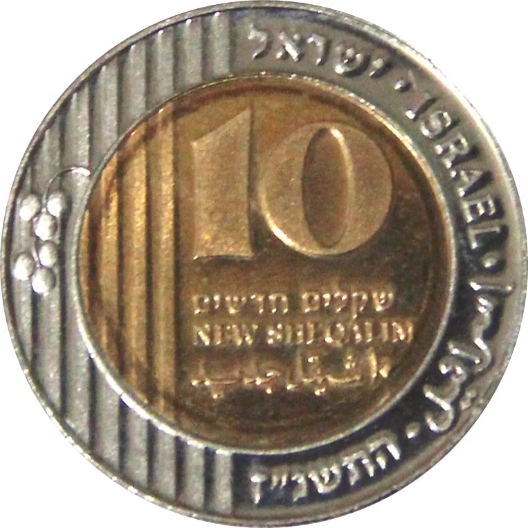 "10 New Sheqalim" and "Israel" in Hebrew, Arabic, and English; Hebrew date; date branch with vertical lines.