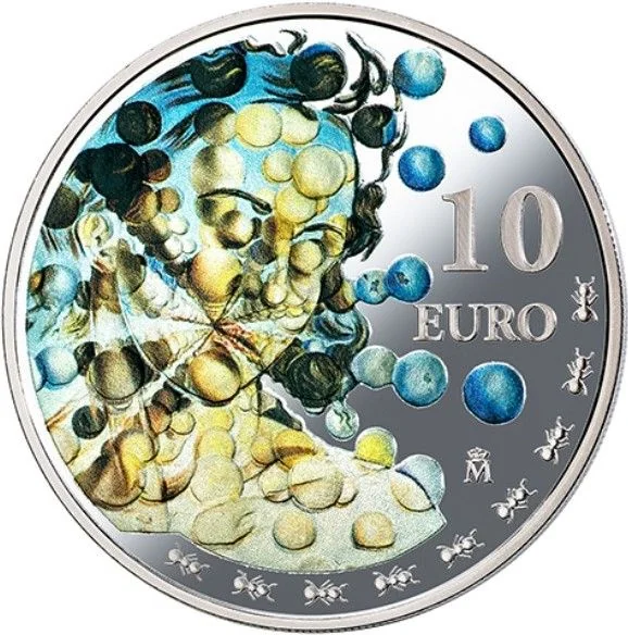 Front-facing bust of Salvador Dalí by Melitó Casals, with his signature at top right. The background references "The Disintegration of the Persistence of Memory," all bordered by a procession of ants.