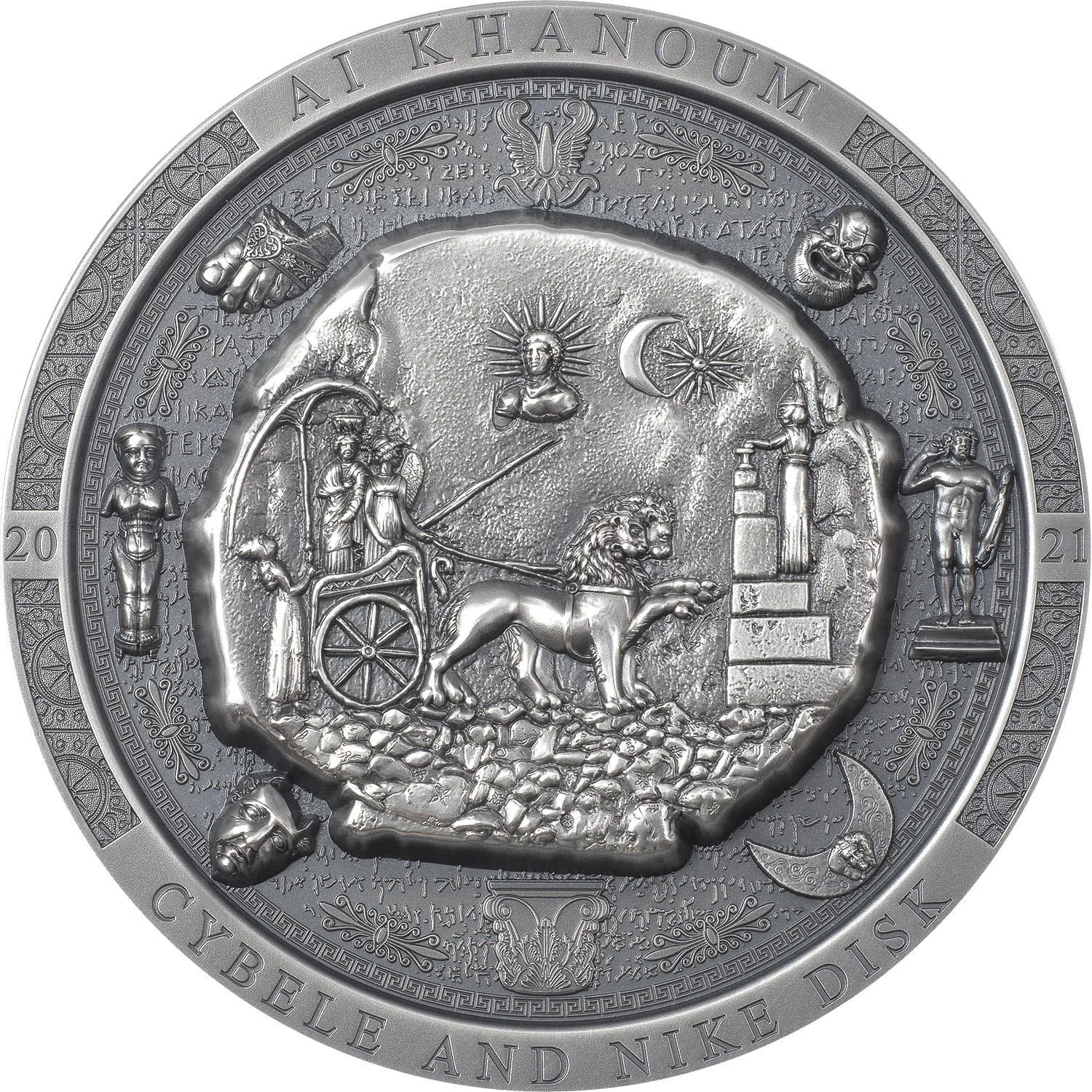 The Bactrian Cybele disk in ultra-high relief, preserved with its archaeological cracks and dents.