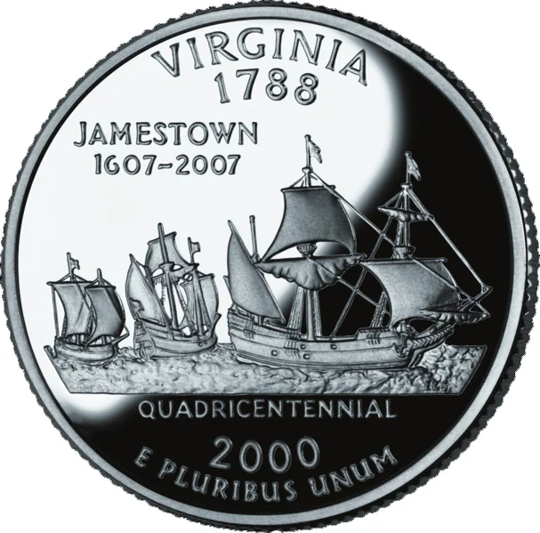 A rendering of the 1607 arrival of the Susan Constant, Godspeed, and Discovery at Jamestown, with the legends "JAMESTOWN 1607-2007", "QUADRICENTENNIAL", "VIRGINIA", "1788", and "E PLURIBUS UNUM".