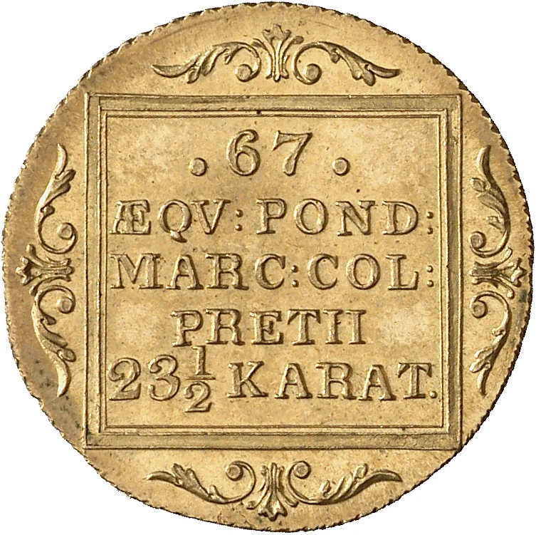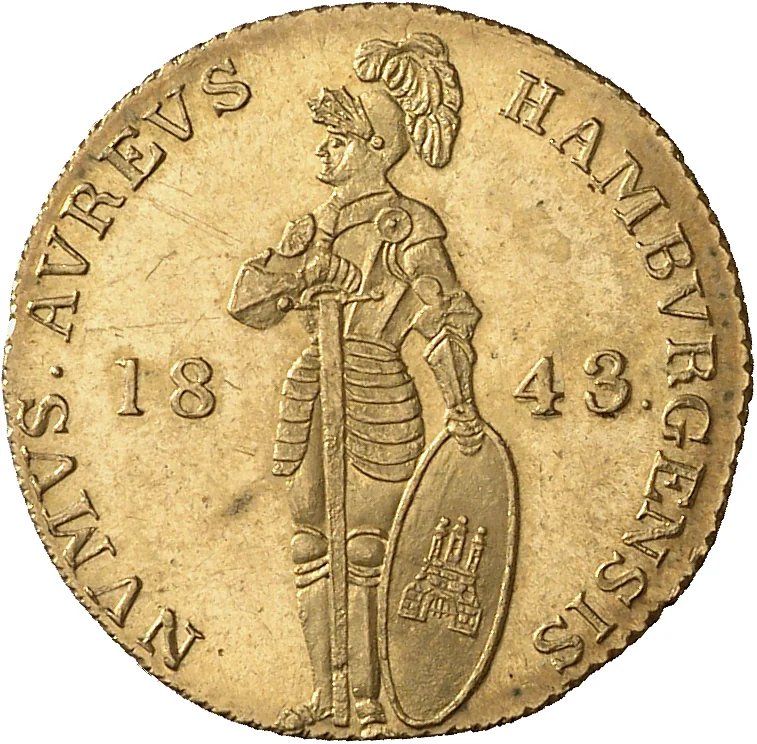 Knight in armor holding a shield with Hamburg's arms and a sword, splitting the date. Legend surrounding.