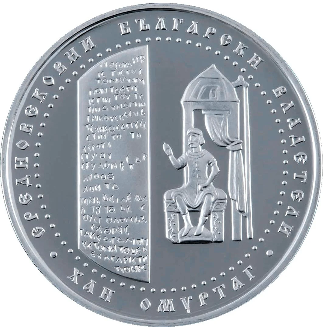 Description: The reverse depicts the Chatalar Inscription column and a Skylitzes chronicle fragment showing the ruler, encircled by the inscriptions "СРЕДНОВЕКОВНИ БЪЛГАРСКИ ВЛАДЕТЕЛИ" and "ХАН ОМУРТАГ".
