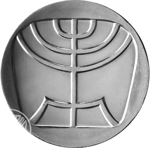 A stylized seven-branched menorah within an incuse trapezoid with rounded edges.