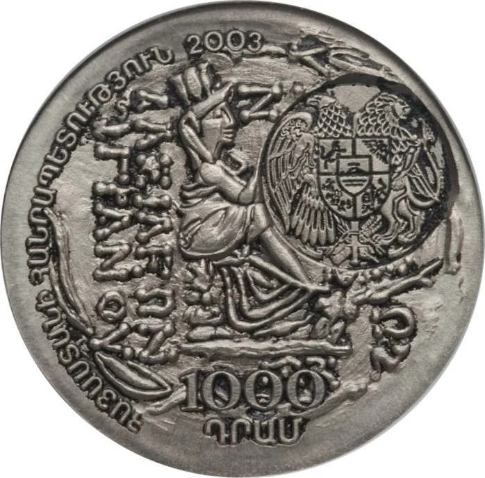 Modern coat of arms on a tetradrachm of Tigran design, with date above and value below.