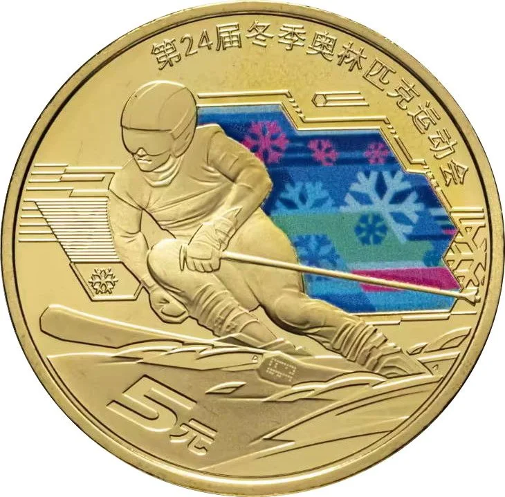 Sport Mode Alpine Skiing / Ski micro-symbol, latent image left, colorful snowflakes right / Denomination under 5元 / Title: XXIV Winter Olympic Games