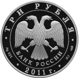 Center: Bank of Russia emblem (two-headed eagle, wings down, with "БАНК РОССИИ" below), circled by dots. Rim inscriptions: top - "ТРИ РУБЛЯ"; bottom left - metal and fineness; center - "2011 г."; bottom right - metal content and mint mark.