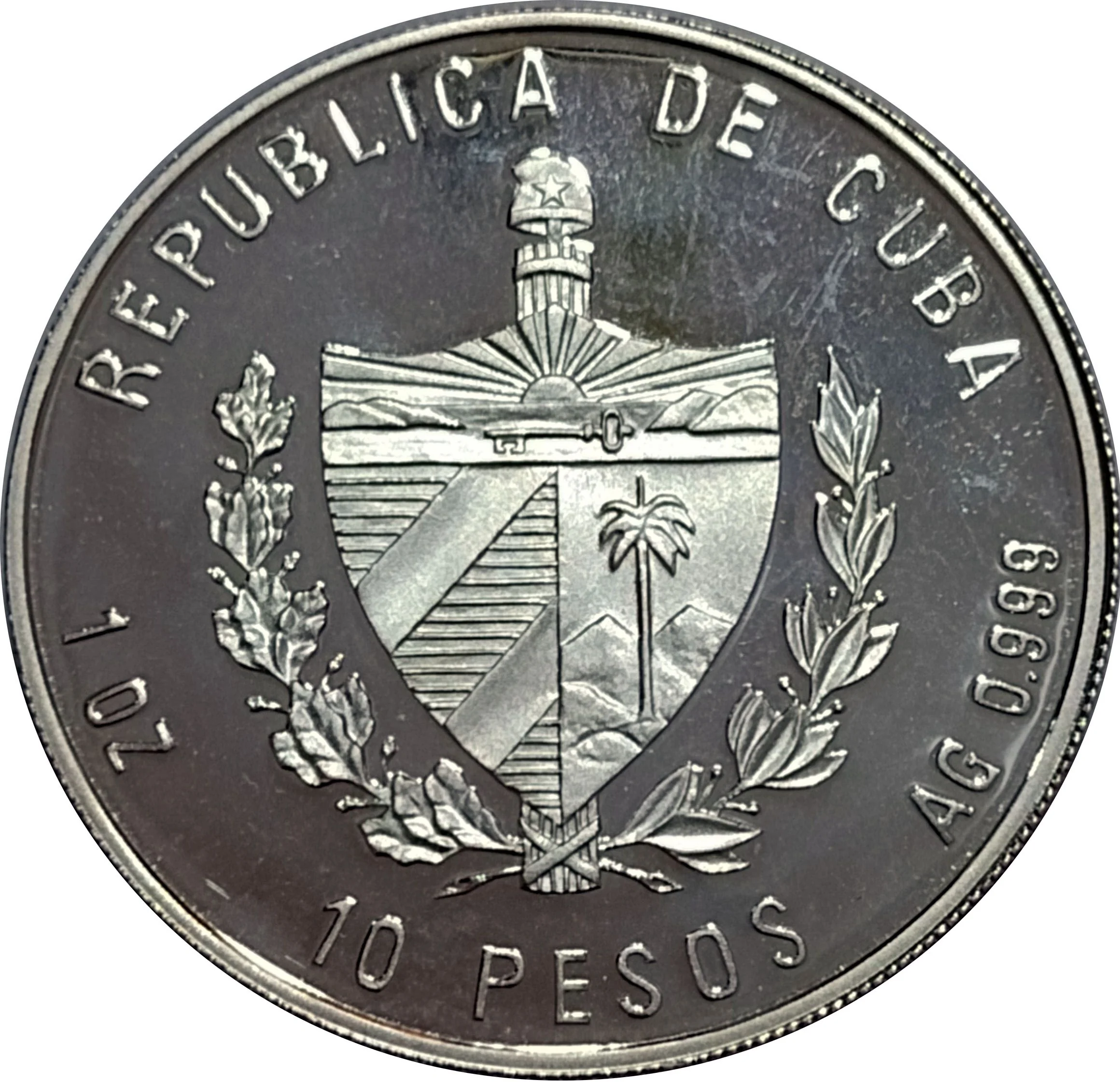 Cuban coat of arms with country name above, face value below, and weight/fineness on the sides.