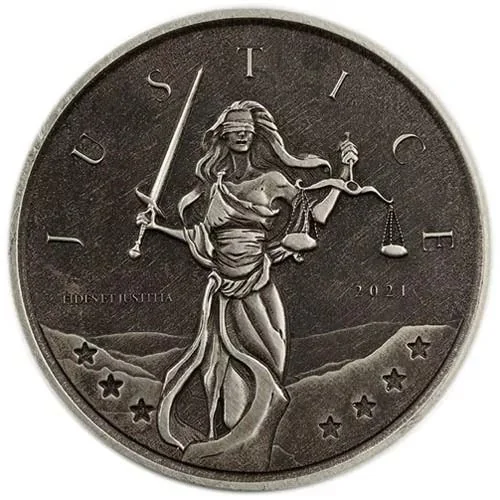 Justitia facing forward, blindfolded, holding a sword and scales; seven stars below.