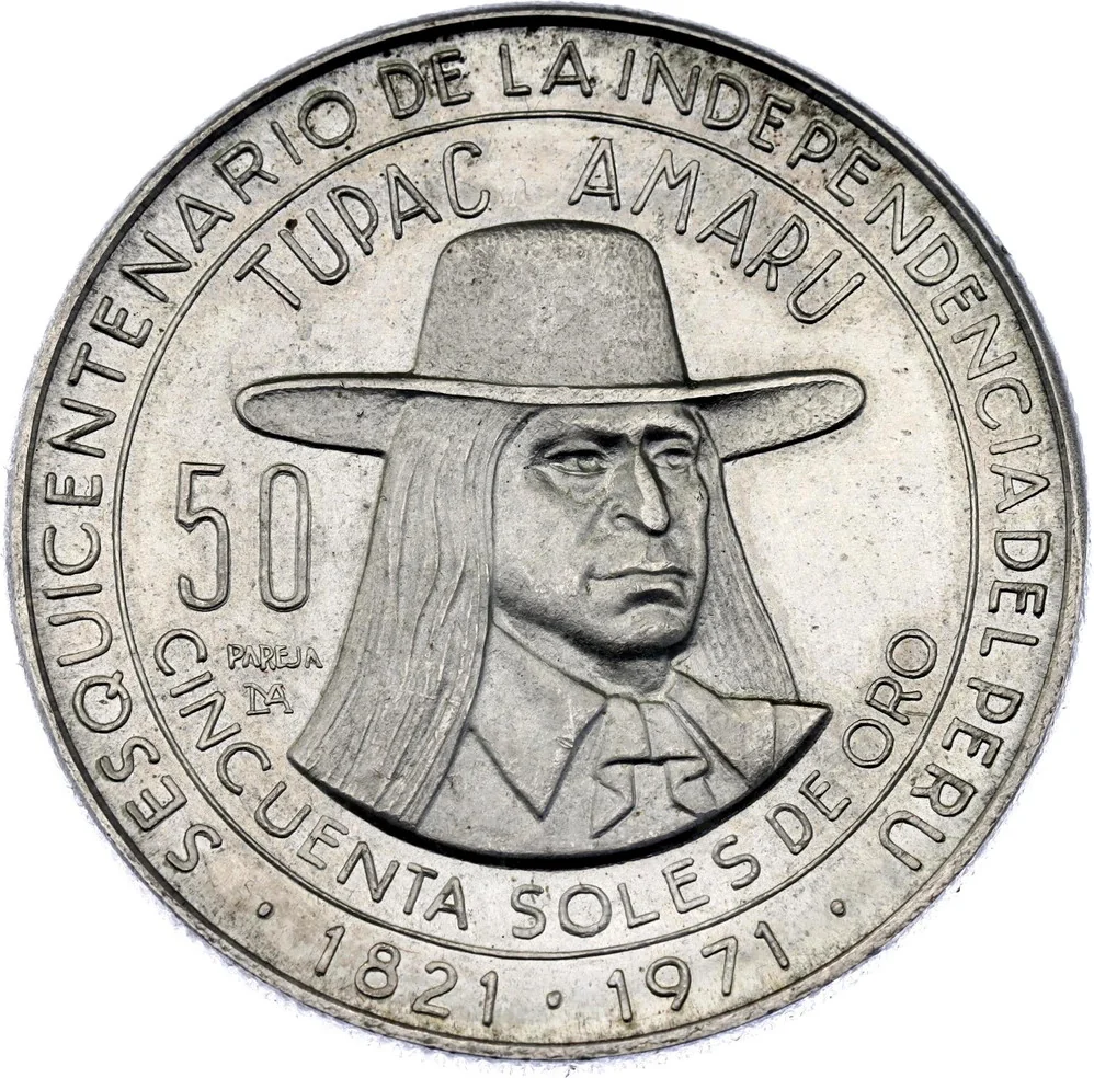 Portrait of Túpac Amaru facing right in a wide-brimmed hat, with his name above and face value below. The left side features the numbered value, designer name, and mintmark monogram, all within a lined circle and surrounding inscription.