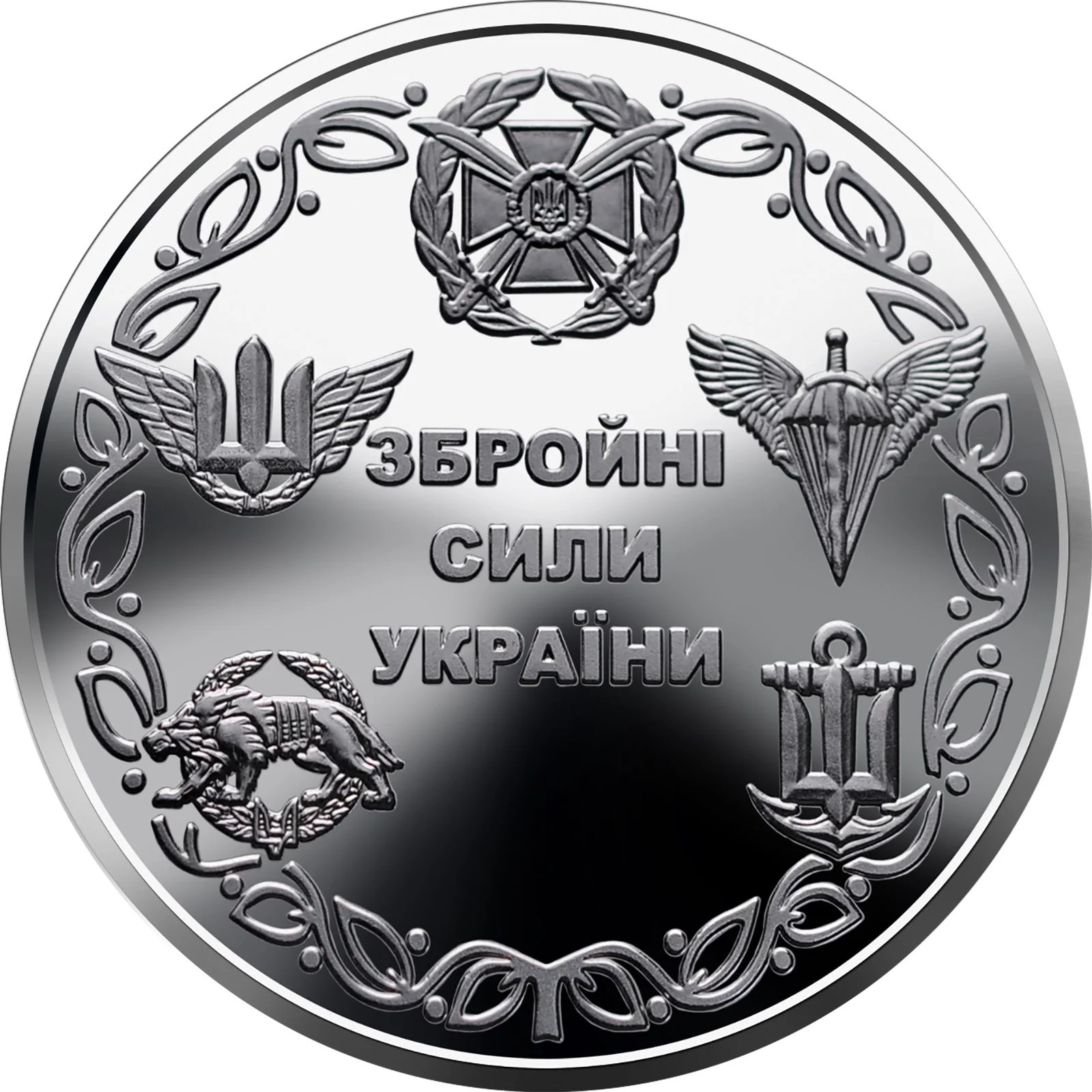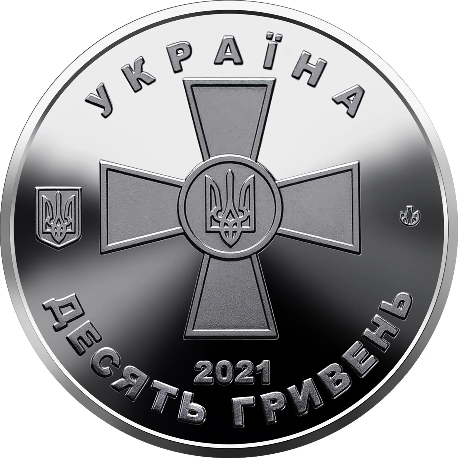 Description: The obverse features Ukraine's semicircular name above, the Armed Forces emblem centered with the small coat of arms to its left, and the mint mark to its right. Below are the year (2021) and face value (ten hryvnias).