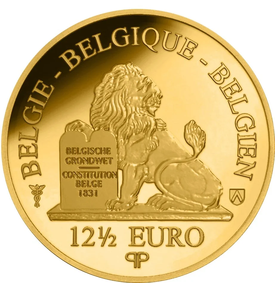 A Belgian lion seated with its paw over a stele inscribed "BELGISCH GRONDWET - CONSTITUTION BELGE". The edge bears "BELGIE - BELGIQUE - BELGIEN". Below are the coin's value and the "qp" hallmark.