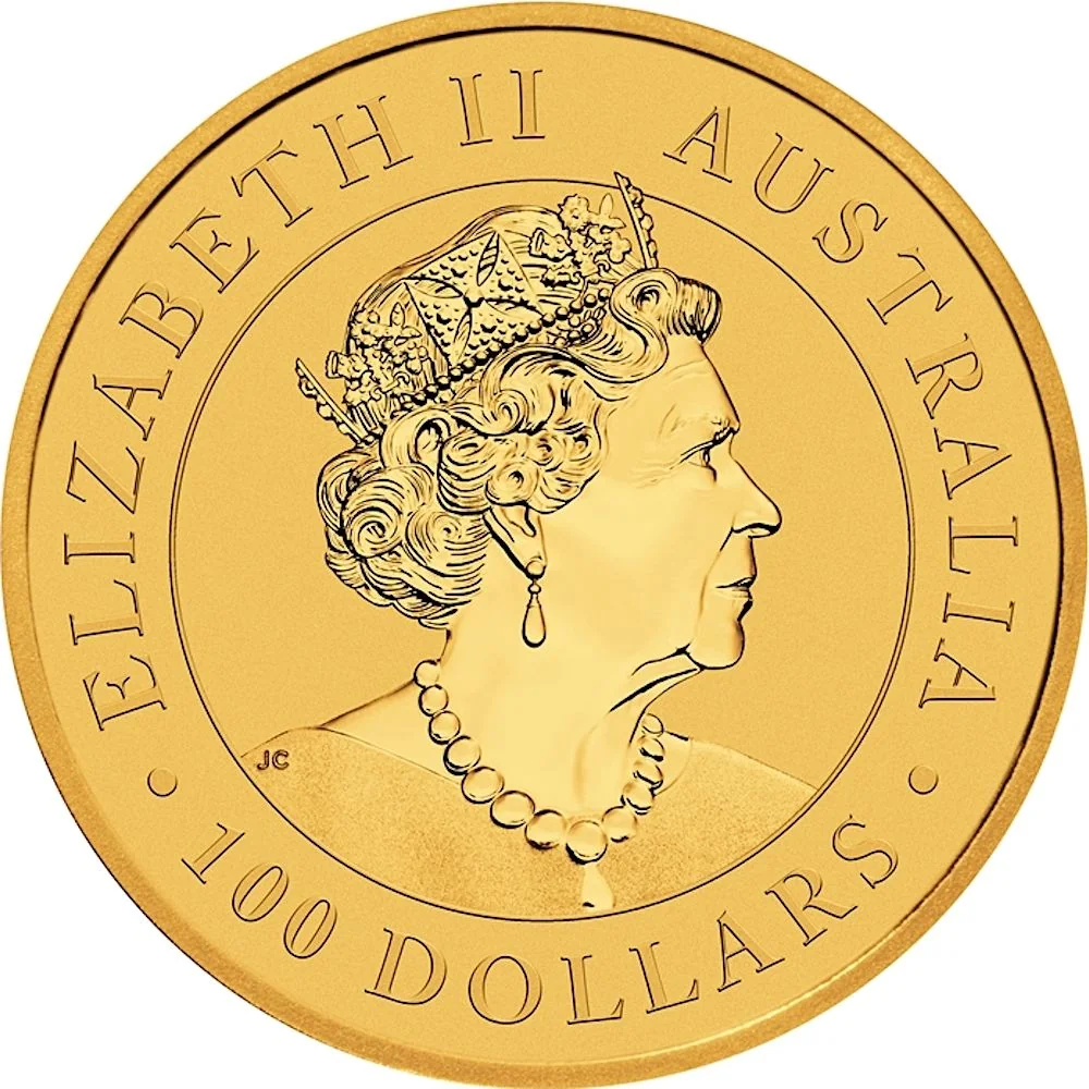 A kangaroo and joey bound across a grassy plain toward distant hills. "KANGAROO" appears in a new font at top right, with weight, purity, and year at top left. The Perth Mint 'P' is at bottom left, designer initials 'NH' at bottom right, and a micro-laser 'P' is etched within the 'K'.