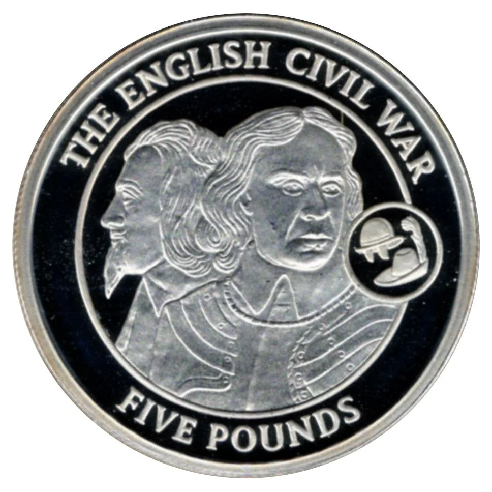 Portraits of Charles I and Oliver Cromwell with a cameo of their factions' hats.