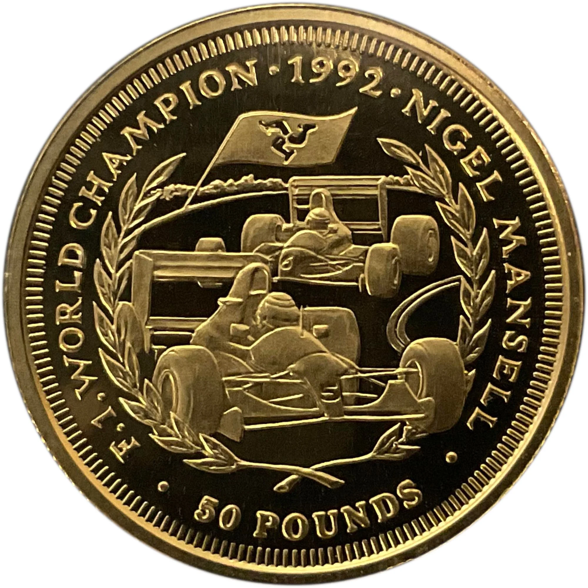 Two F1 cars, Isle of Man flag above, legend around, denomination below.
