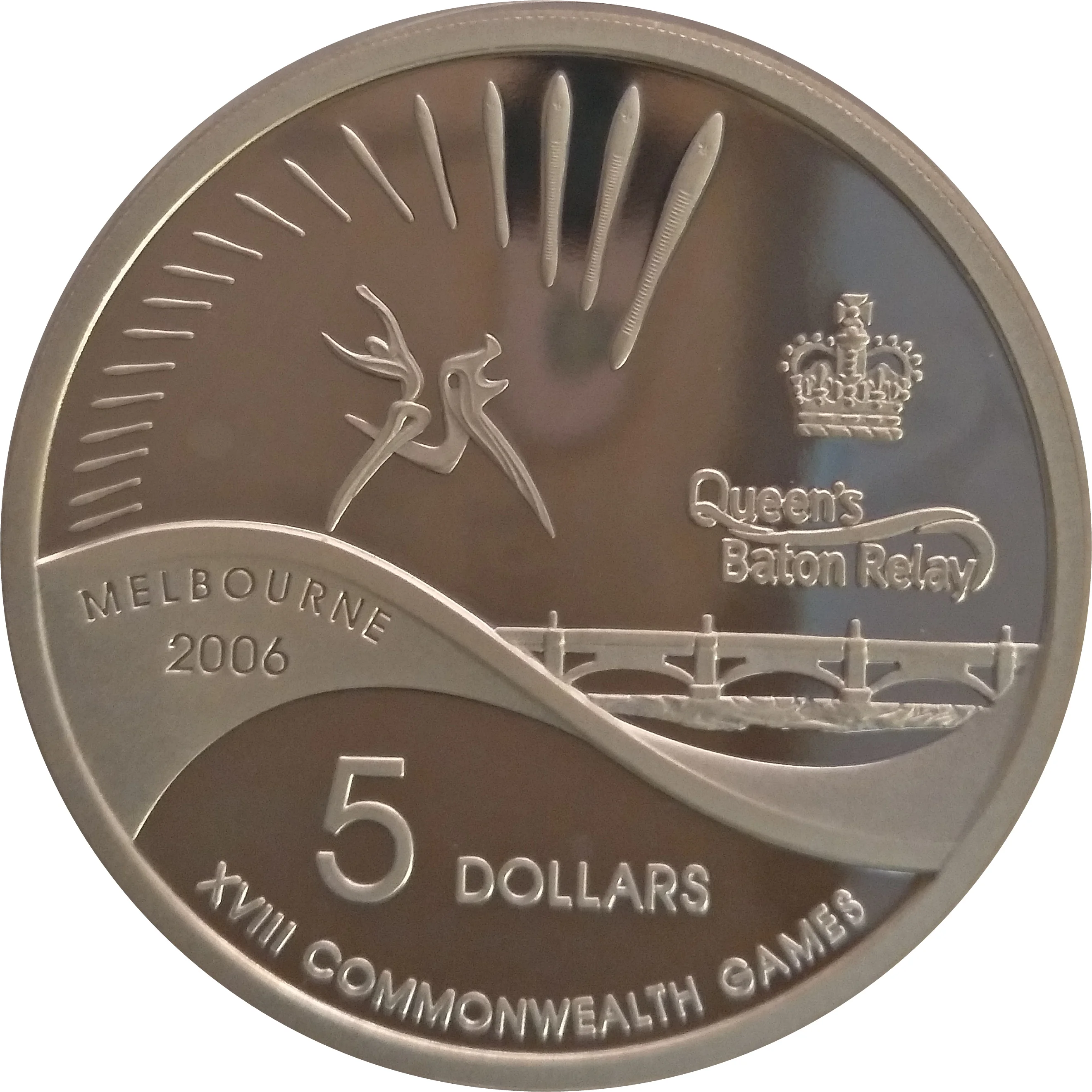Stylized runner with baton. Princess Bridge, Melbourne, with 18 batons and a Commonwealth Crown.