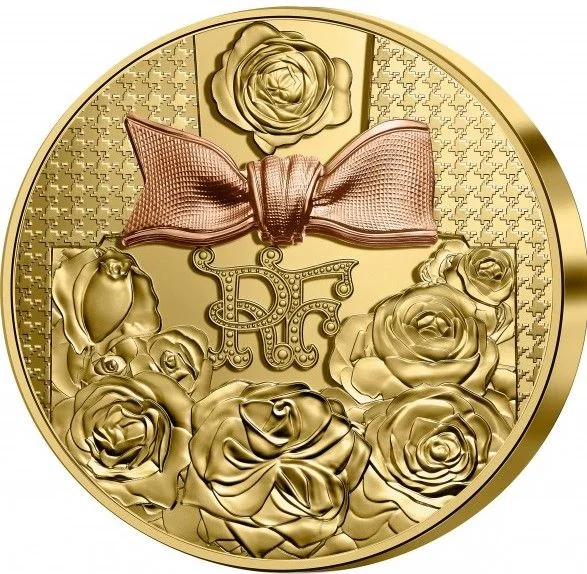 Le flacon repose sur un lit de roses de Grasse. Le nœud, un ornement emblématique de Dior, est en or rose et appliqué après frappe pour un effet bombé évoquant un tissu souple. La mention RF figure au centre, et un motif pied-de-poule entoure le flacon.