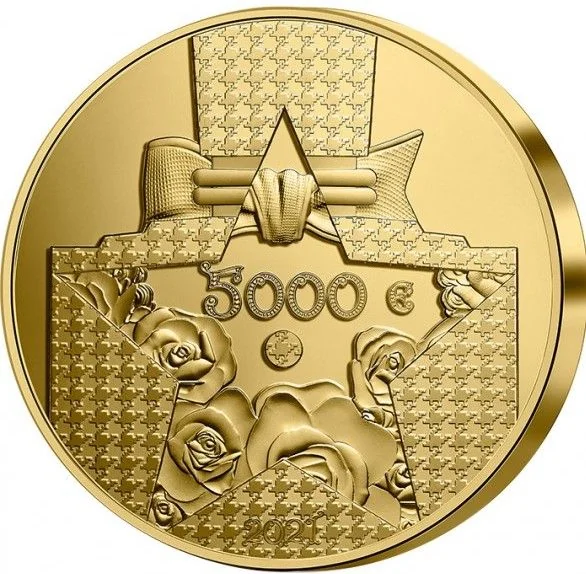 Un motif étoilé crée une illusion de transparence. La valeur de 5 000€ figure au centre, et un pied de poule orne l'intérieur du flacon.
