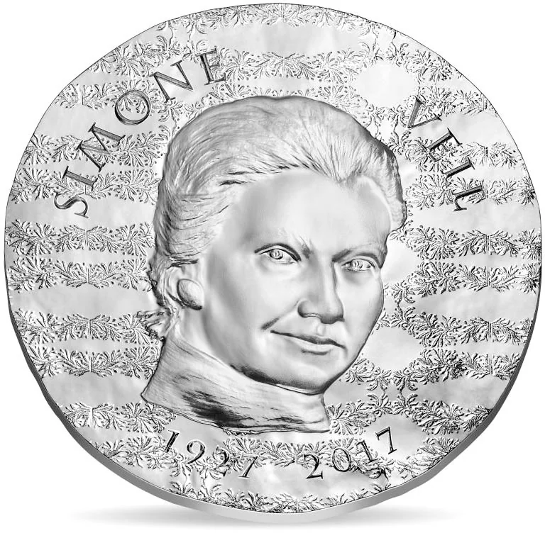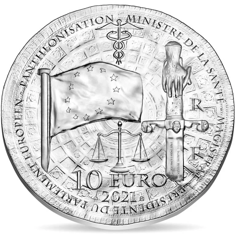 Simone Veil's symbols: a balance for her judicial role, a caduceus for Health, the European flag for her EU work, and a hand and sword for the Académie Française.