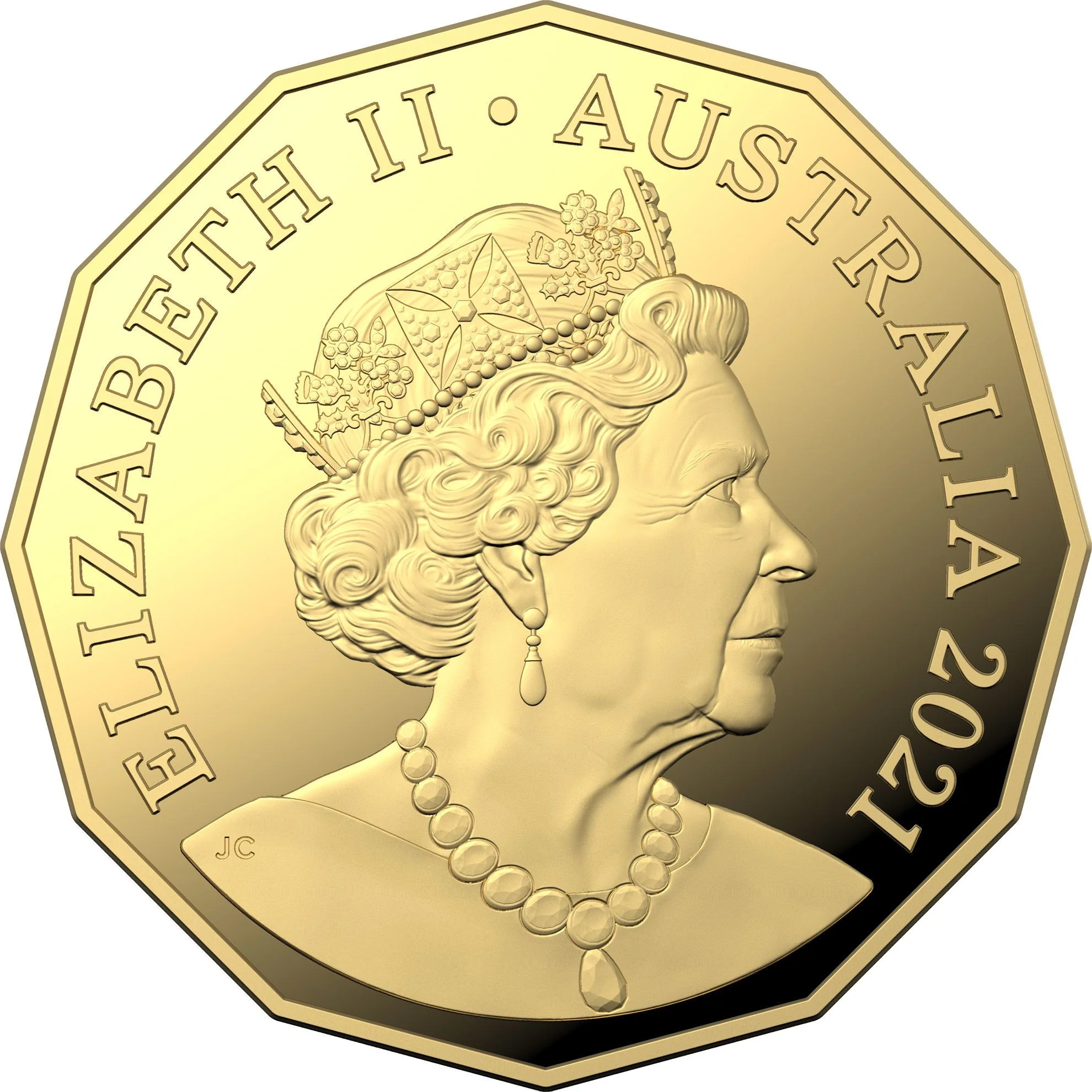 Queen Elizabeth VI in profile, wearing the George IV State Diadem and Victorian Coronation Necklace.