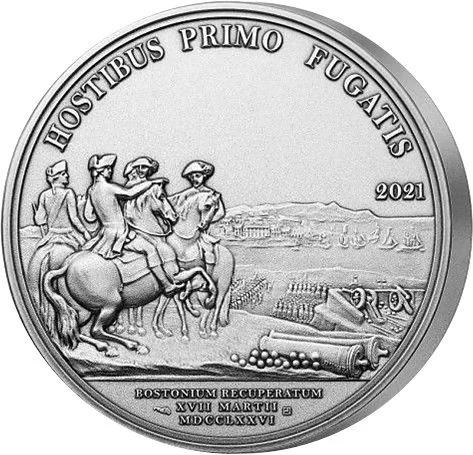 Washington leads officers toward Boston, with a fort, cannons, and fleeing British ships to the right.