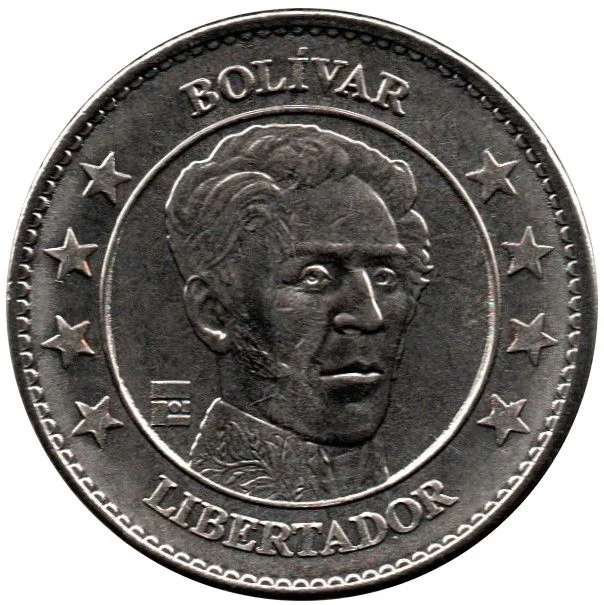 Simón Bolívar's portrait inside a circle, surrounded by eight stars (four on each side) on the coin's outer ring.