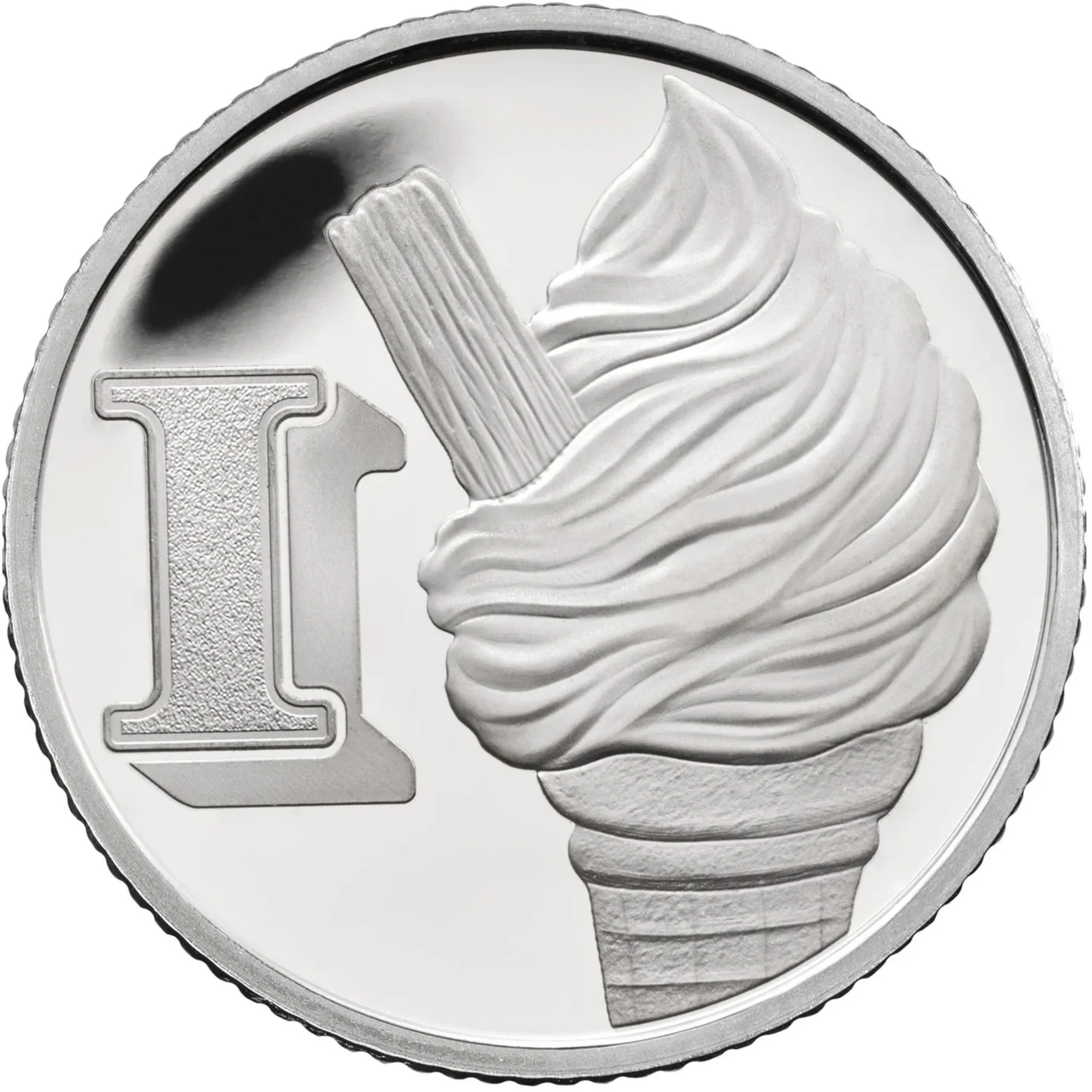 An ice cream cone with a chocolate flake beside an 'I'.