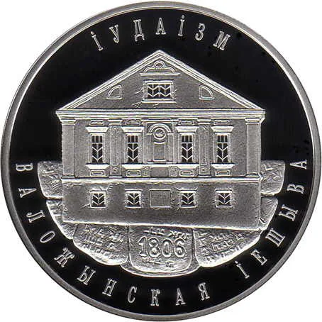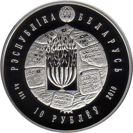 Description: Featuring the State Coat of Arms and "РЭСПУБЛІКА БЕЛАРУСЬ" above, a stylized menorah in the center, and "10 РУБЛЁЎ" below. The year of issue is on the right and the alloy standard on the left.