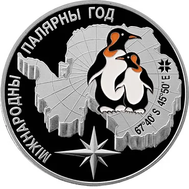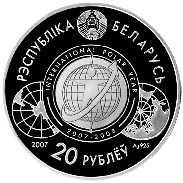 Description: Obverse: Belarusian state coat of arms and REPUBLIC OF BELARUS inscription. Center: International Polar Year emblem. Reverse: Denomination 20 RUBLES, year, and alloy standard.