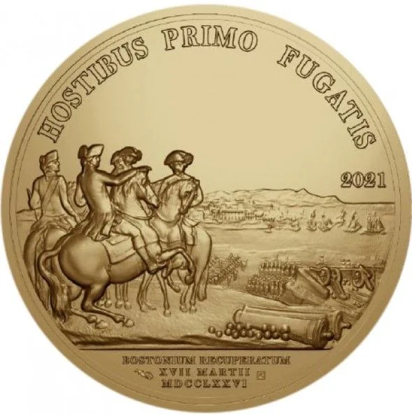 Washington leads officers toward Boston, with a fort, cannons, and fleeing British ships to the right.