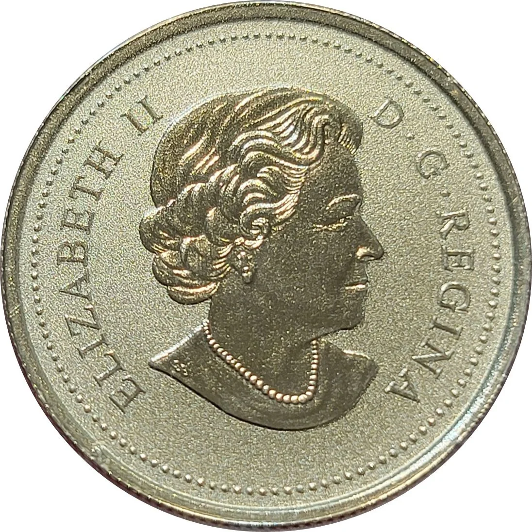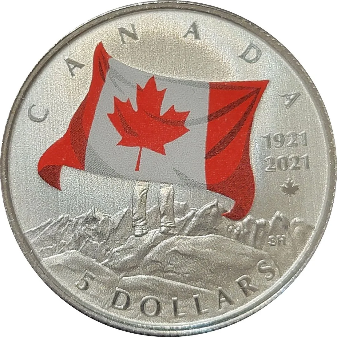 Designed by artist Steve Hepburn, this coin’s reverse is double-dated (1921-2021) for the centenary of Canada’s national colours. Its selectively coloured image shows a Canadian on a mountaintop, proudly raising the red-and-white flag.