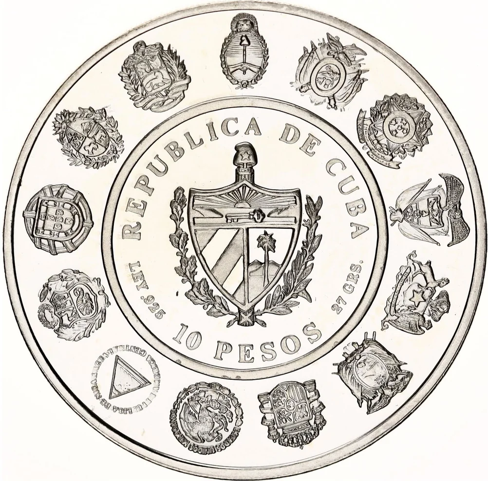 Description: Cuban coat of arms with country name above, denomination below, fineness and weight on sides, all within an inner circle; surrounded by an outer ring of 13 coats of arms from other participating countries in the series.