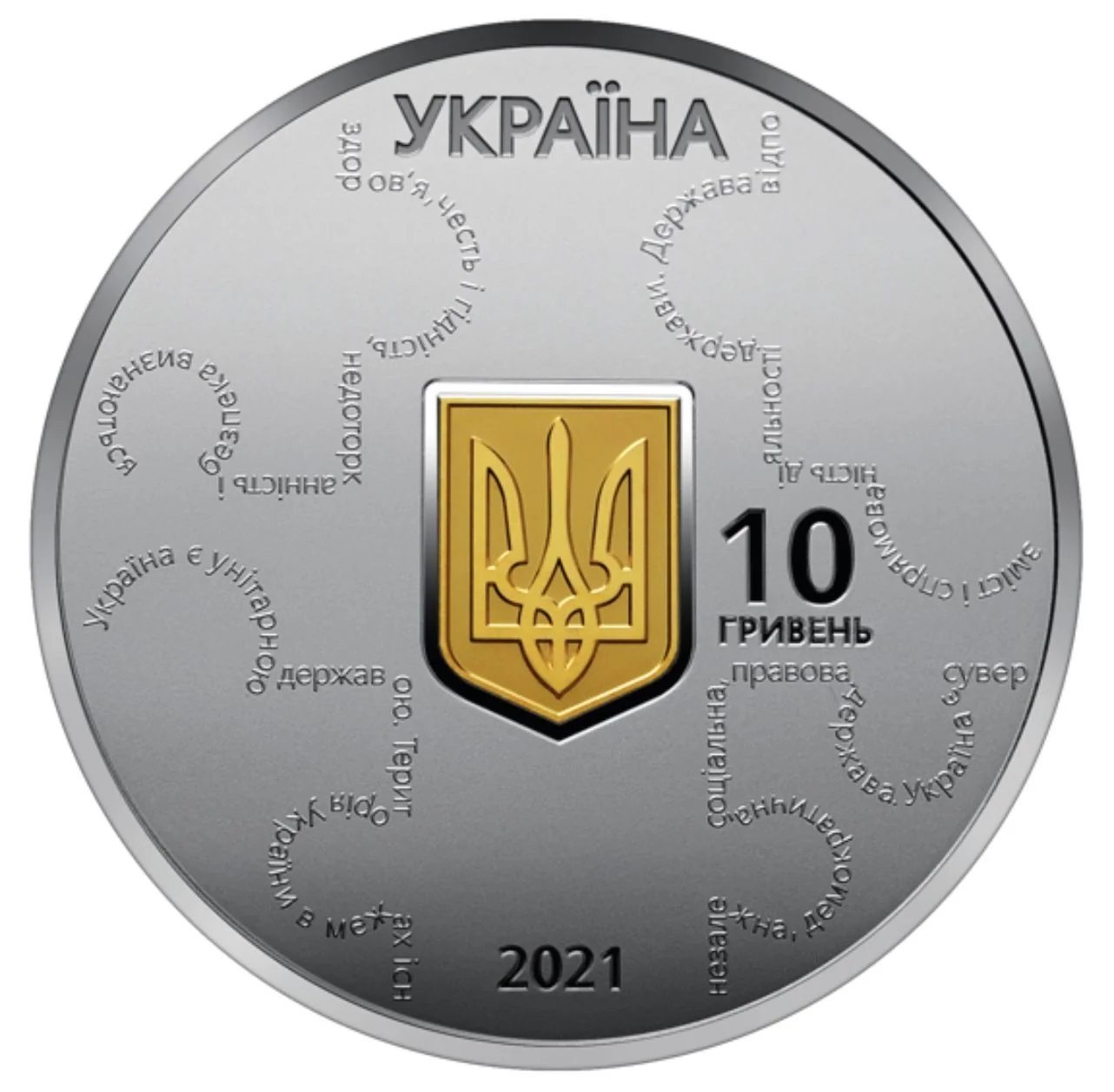 Ukraine's gold-plated small coat of arms is centered on a matte, solved-puzzle background outlined with microtext of constitutional quotes. Above is "УКРАЇНА," to the right the face value "10/ГРИВЕНЬ," and below the issue year "2021."