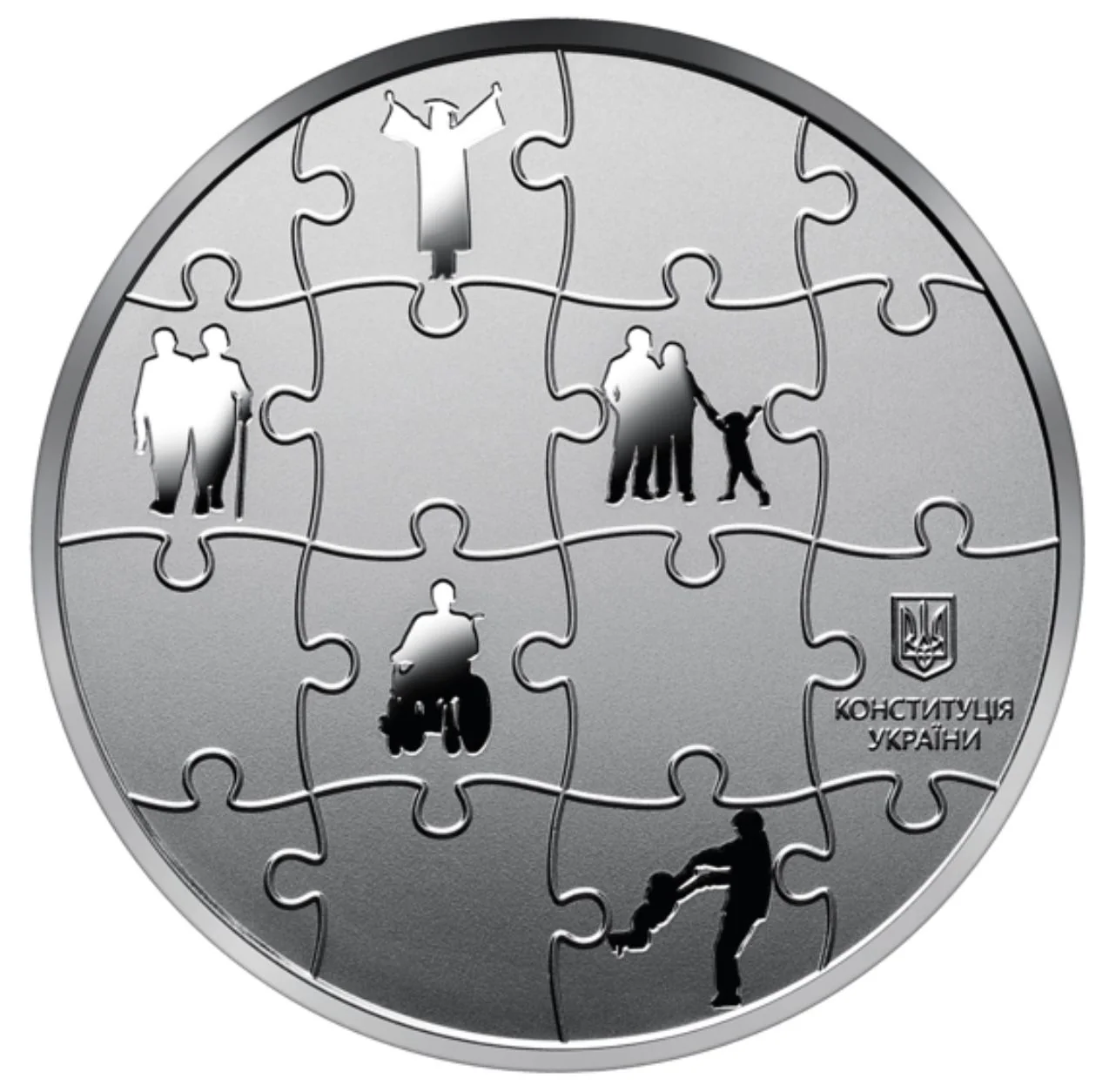 Silhouetted figures on a solved puzzle represent Ukrainians as protected parts of a whole, beside Ukraine’s coat of arms and the text “КОНСТИТУЦІЯ УКРАЇНИ.”