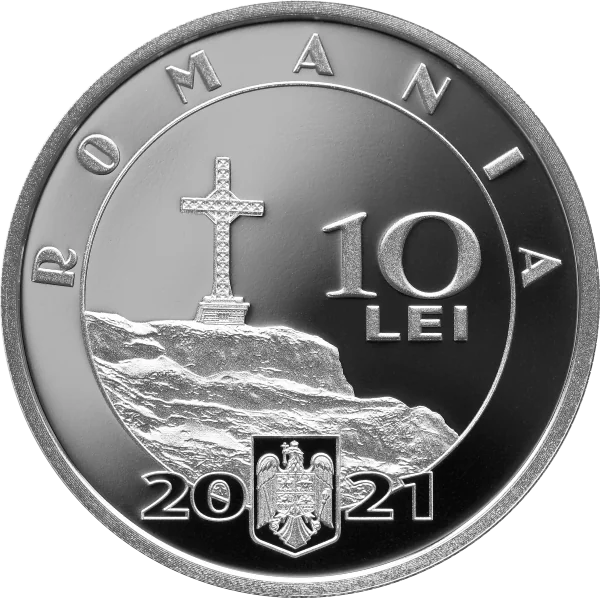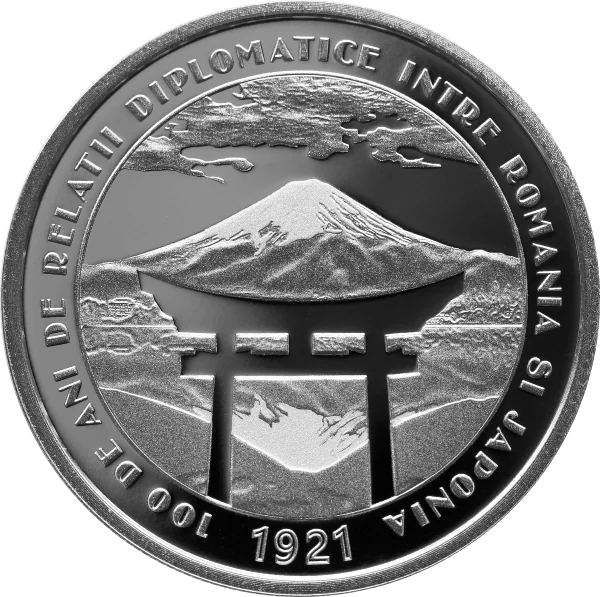 Reverse: Japan's national symbols—a torii gate over Mount Fuji reflected in Lake Kawaguchi—with "1921" and the inscription "100 DE ANI DE RELATII DIPLOMATICE INTRE ROMANIA SI JAPONIA."