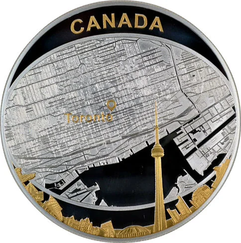 Toronto through an astronaut's visor, with gold border and landmarks below.