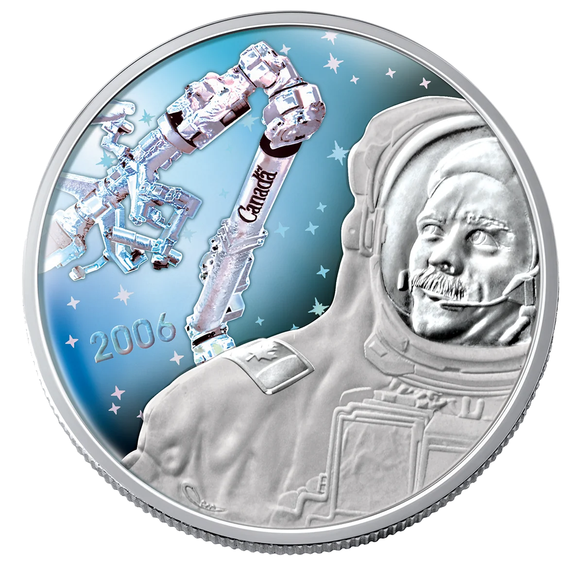 Astronaut Chris Hadfield installing Canadarm2 against a starry backdrop.