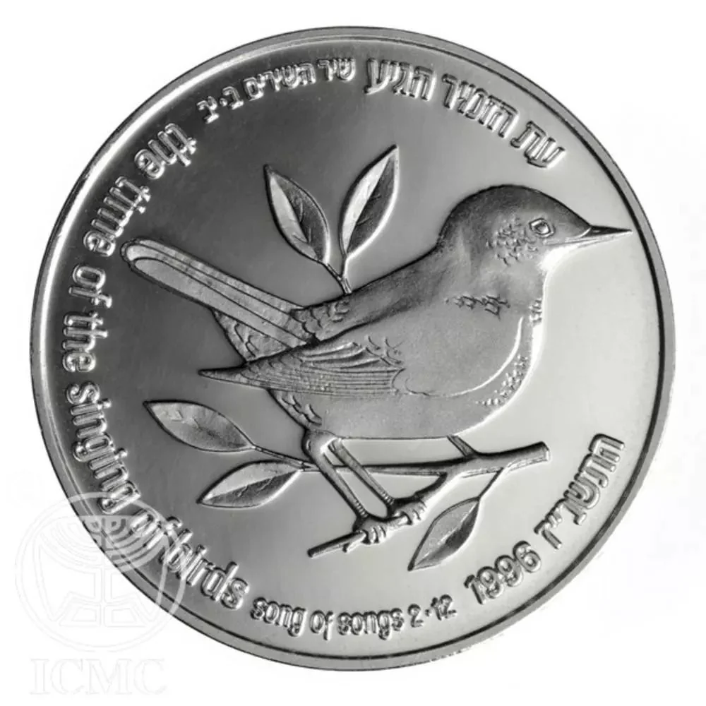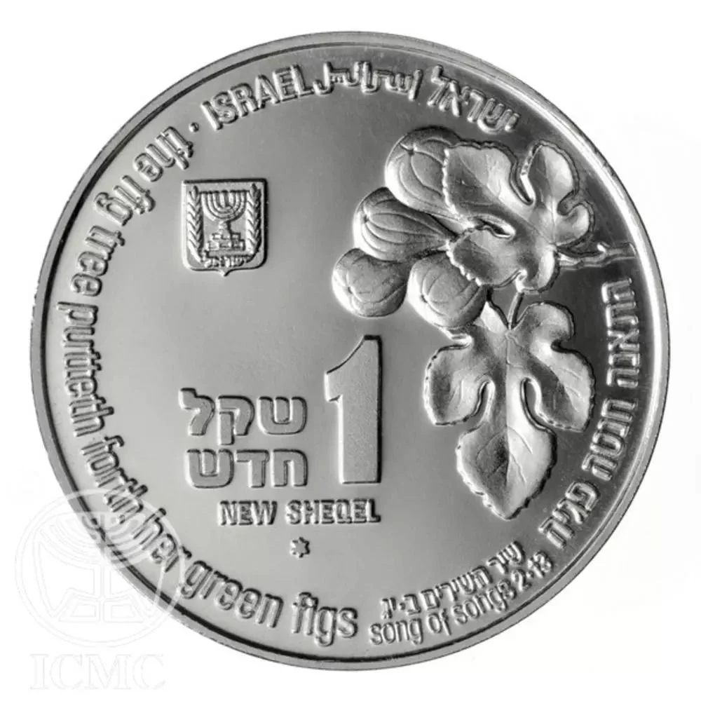 Description: Face value in Hebrew and English (top left), Israel's State Emblem, and "Israel" in three languages along the top border. Figs and leaves are to the right. The border inscription, from Song of Songs 2:13, reads "The fig tree putteth forth her green figs" in English (left) and Hebrew (right).