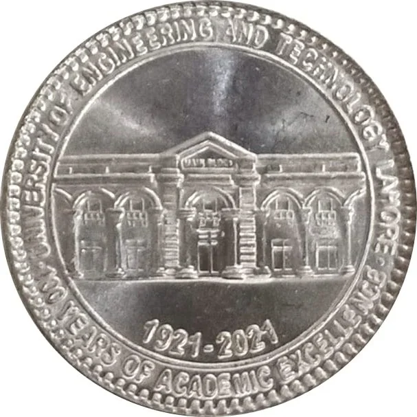 Description: The reverse features the Main Block of the University of Engineering & Technology, Lahore. Around the top periphery is "University of Engineering and Technology Lahore," and around the bottom is "100 YEARS OF ACADEMIC EXCELLENCE." The dates "1921-2021" are inscribed at the bottom to mark the centenary.