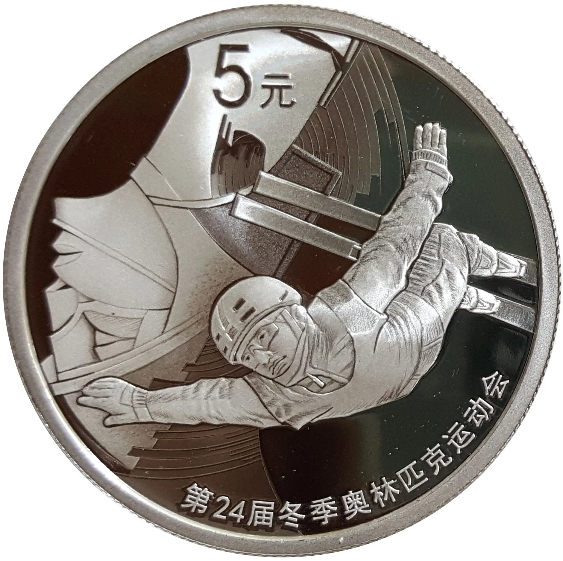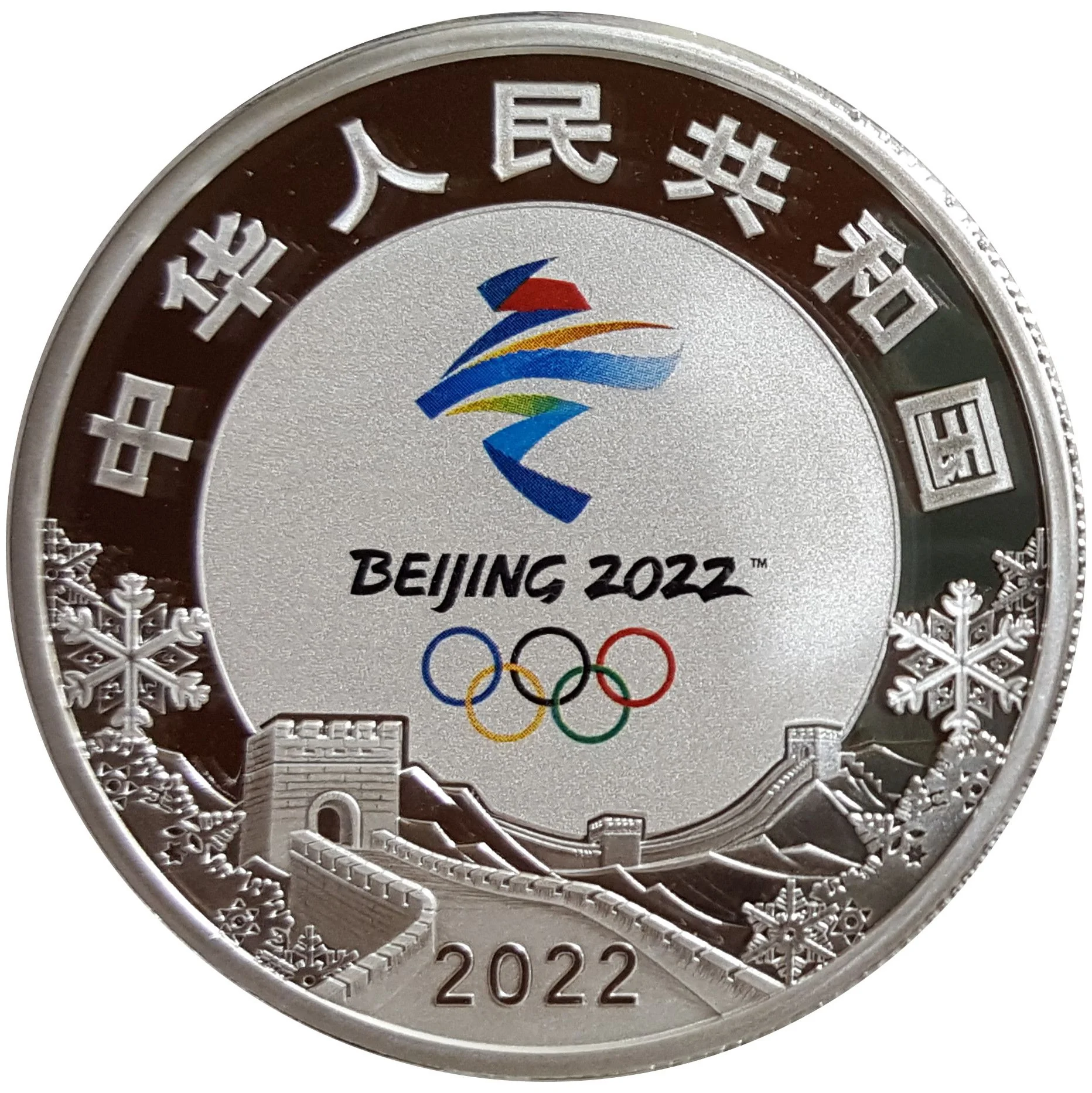 Emblem of the 14th Olympic Winter Games: the Great Wall, snowflakes, "PRC," and the year.