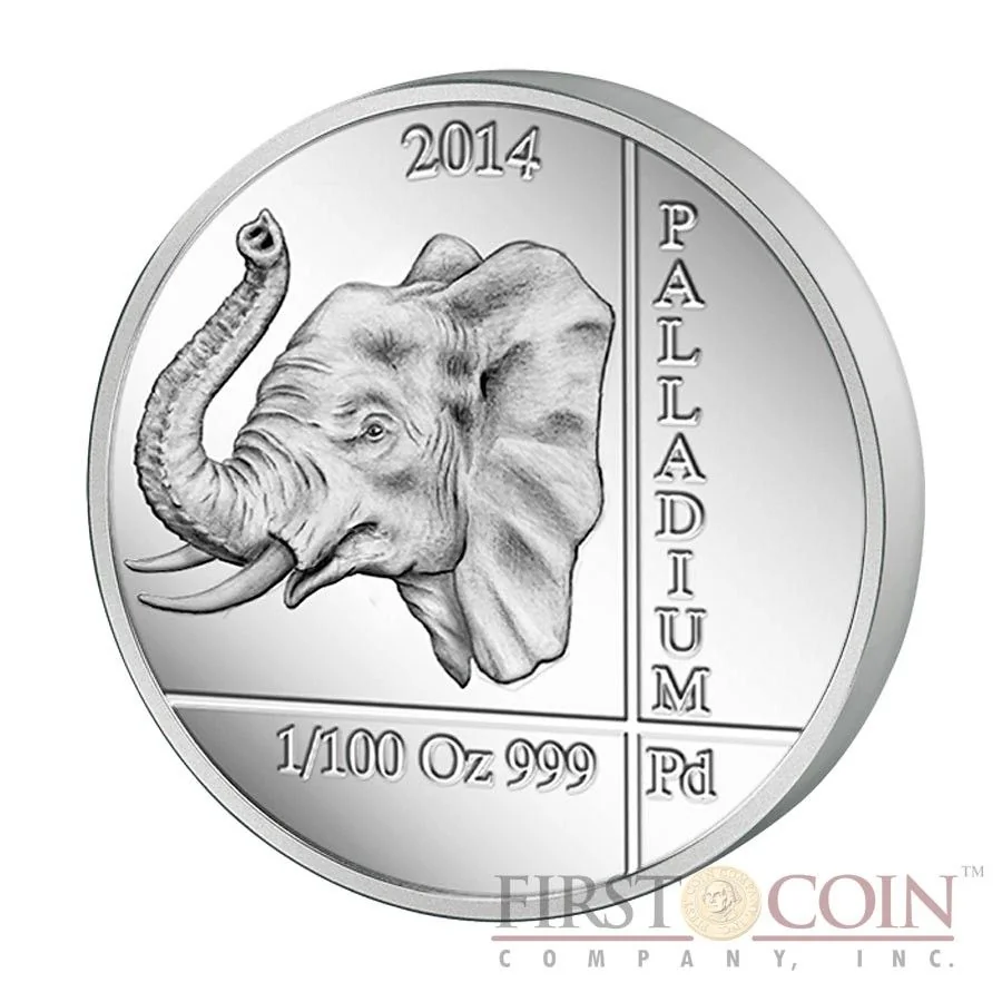 Elephant head left, with date, Latin name, weight, fineness, and chemical symbol.
