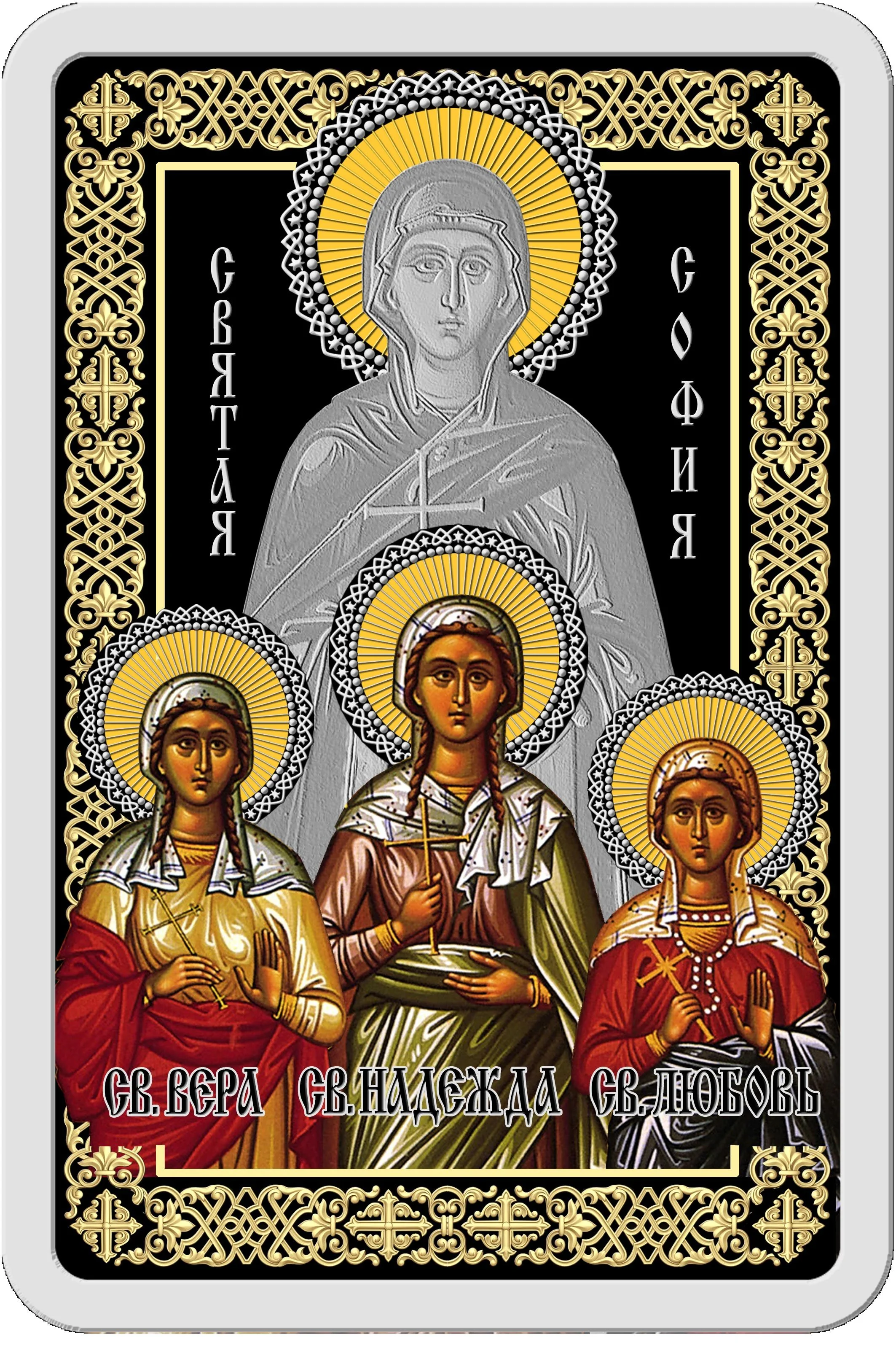 Description: Center: gold images of Saints Faith (cross), Hope (anchor), and Love (children). Below: St. Trophime church in Eschau, Alsace. Top left: denomination. Top right: coat of arms. Lettering below.