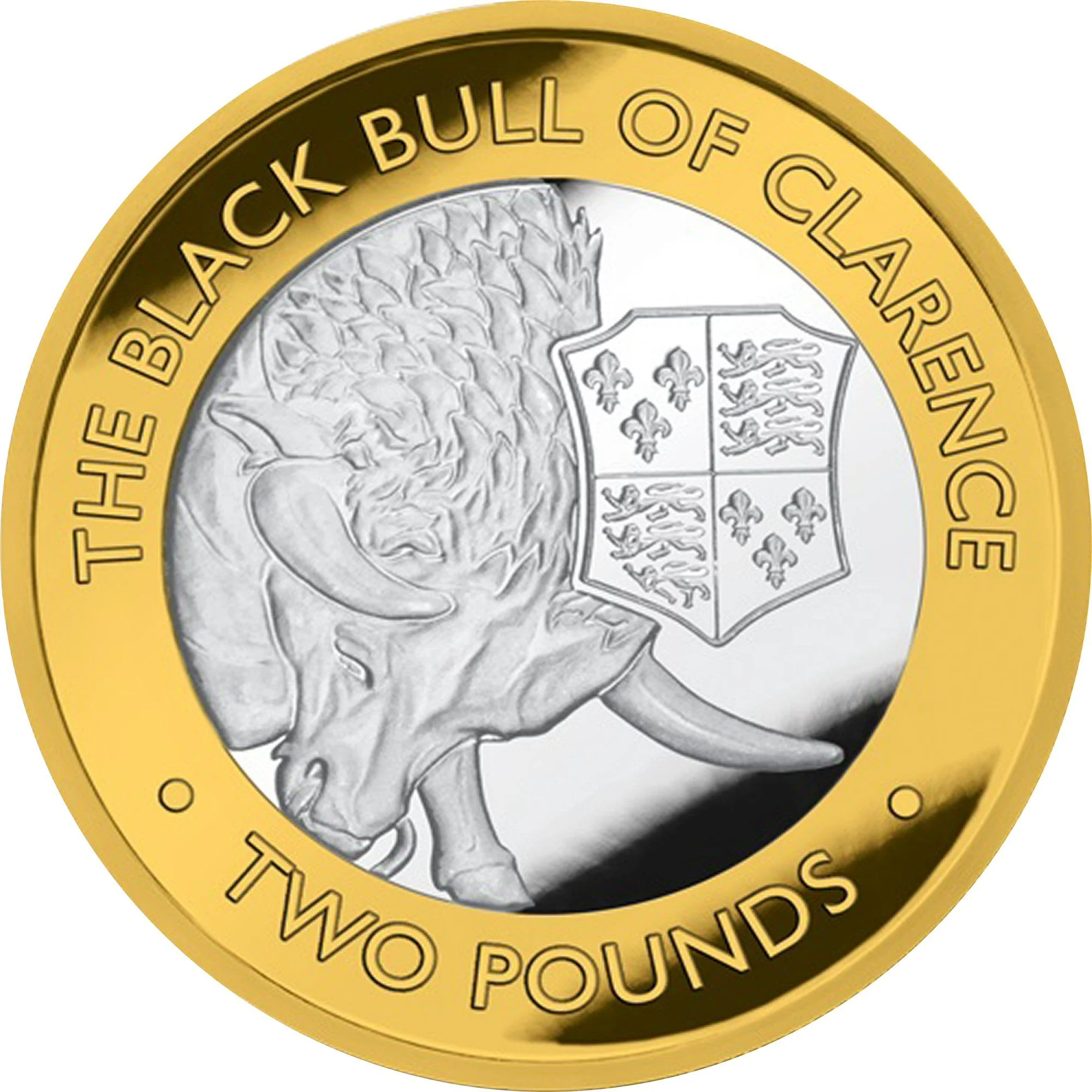 The Black Bull of Clarence with a quartered shield of lilies and lions.