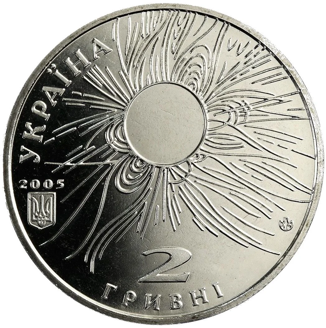 The design features a stylized solar wind motif with the inscription "Україна" (left). Below are the year 2005, Ukraine's national emblem, the denomination "2 ГРИВНІ," and the Mint logo of the National Bank of Ukraine (right).
