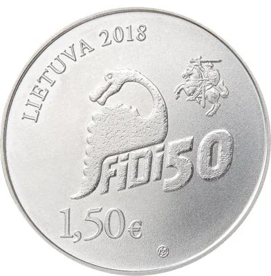Obverse: a stylized dinosaur, symbol of the 50th Physicists' Day at Vilnius University, alongside the Vytis coat of arms. Inscriptions include LIETUVA, 2018, €1.50, and the Lithuanian Mint logo.