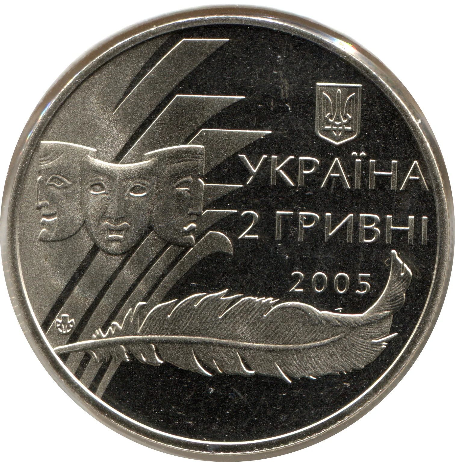 Against a stylized paper background are theater masks, below them a stylized pen and the Mint logo of the National Bank of Ukraine. Above right is the small National Emblem of Ukraine with the inscription: УКРАЇНА/ 2/ГРИВНІ/2005.