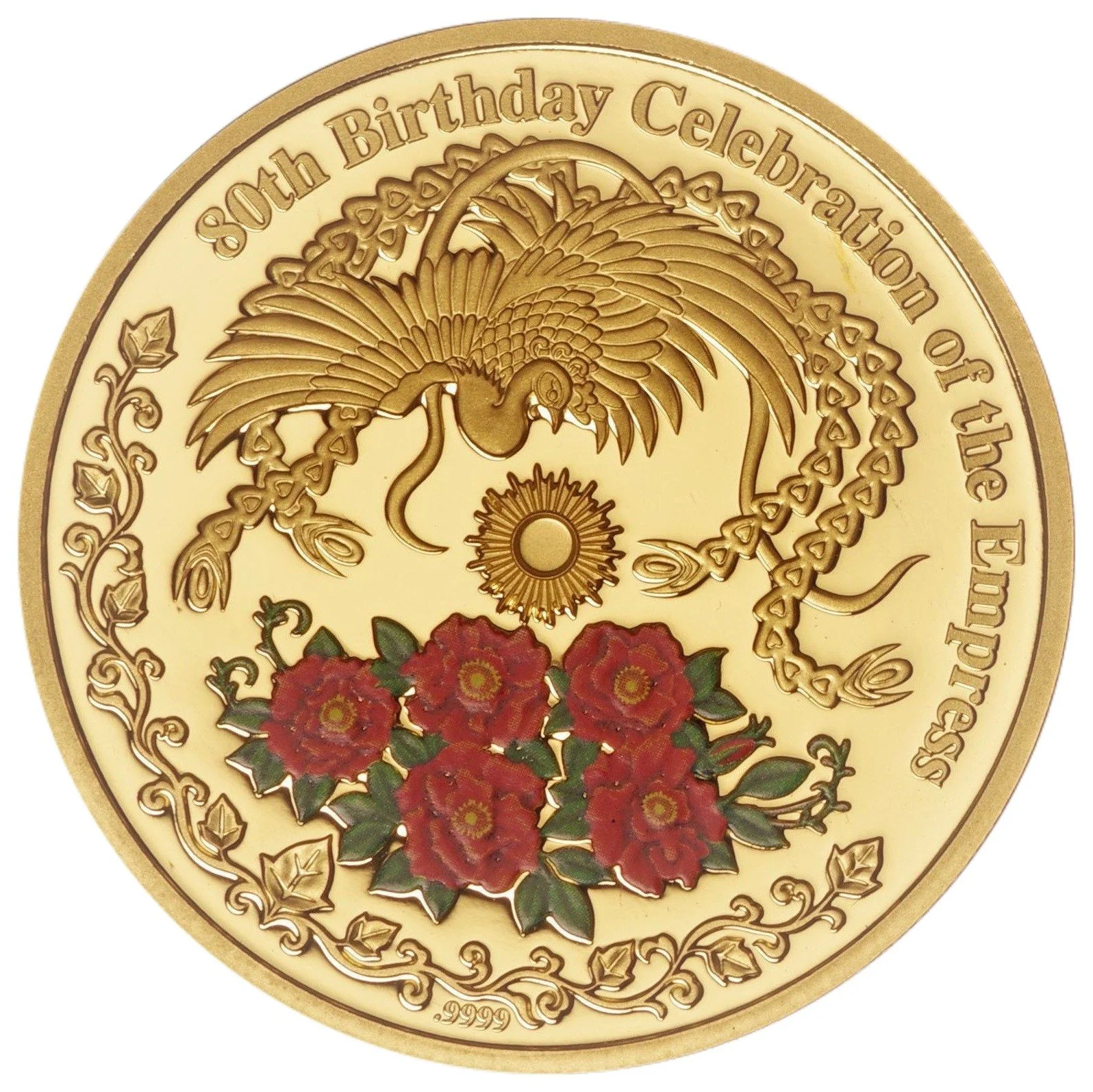 A phoenix, a sun, and red roses.