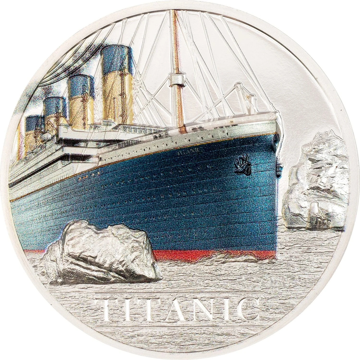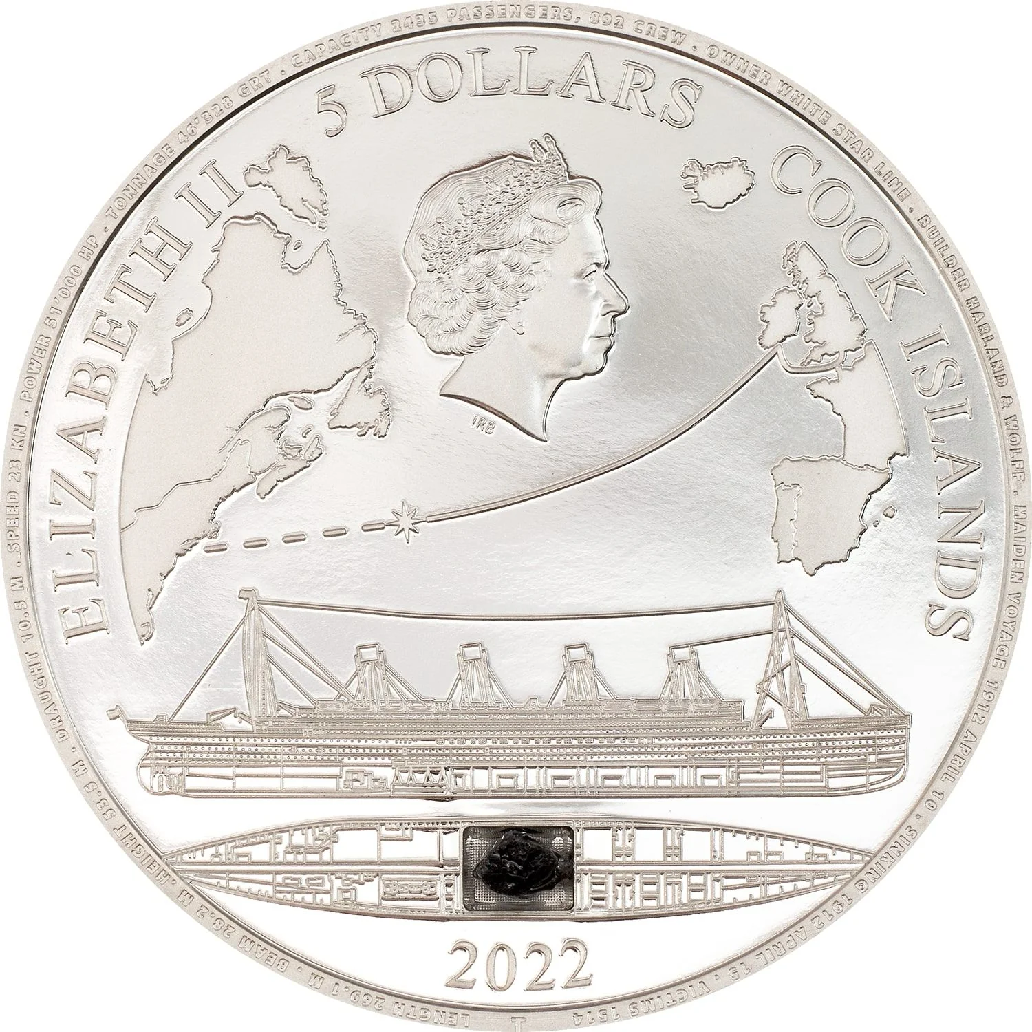 Description: Queen Elizabeth II's effigy above a world map, with Titanic's schematic and recovered coal below.
