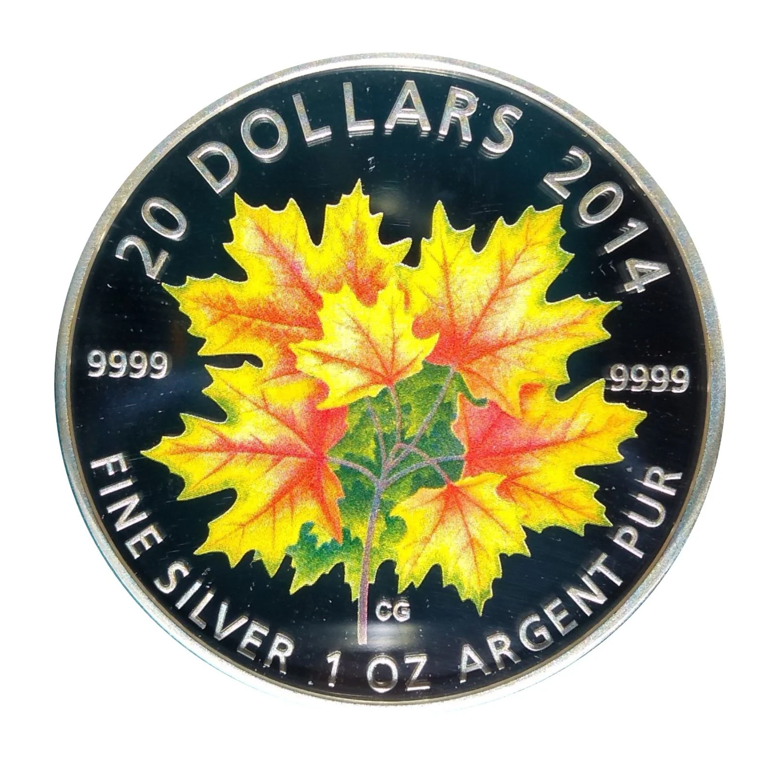 Layered green maple leaves form the background. In the foreground, a branch displays leaves turning red, orange, and yellow. When tilted, a maple leaf appears in the coin's center.